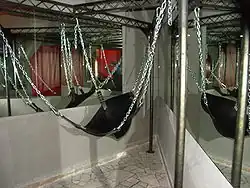 A sex swing (also known as a sling) is a type of harness designed to allow sexual intercourse between one partner suspended by the swing and another who moves freely.[1] Though there is considerable variety in the design, the most common sex swings have a support for the back, another for the buttocks, and stirrups for each leg, which can be adjusted whilst the user is suspended.[2]