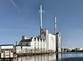 In 1898 the farmer's cooperative Jysk Andelsfoderstofforretning (JAF) was established and headquartered in Aarhus for the purpose of managing and selling agricultural products. The company became one of the largest in the country, opening trade hubs throughout the realm.[3] In 1927 the silo complex was erected in the south harbor with designs by the architect Hjalmar Kjær. The new structure heralded a change in labor processes with physically demanding work being replaced by electrical engines and elevators. Initially the silos had capacity for 12000 cubic meter oilseed and 13800 cubic meter grain while the lifting systems could handle 120 metric tonnes per hour. Building the silos into one structure made it possible to aerate the grain by moving it from one silo to another with electrical cup elevators and later vacuums. The elevators were also used to load and unload cargo ships and at the same time unloading coal became mechanized with cranes. The system was the beginning of a greatly reduced labor force in the port.[4]