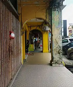 A five-foot way (Malay/Indonesian: kaki lima) is a roofed continuous walkway commonly found in front of shops in Malaysia, Singapore, and Indonesia which may also be used for commercial activity. The name refers to the width of the passageway, but a five-foot way may be narrower or wider than 5 feet (1.5 m). Although it looks like European arcade along the streets, it is a building feature that suits the local climate, and characterizes the town-scape and urban life of this region. It may also be found in parts of Thailand, Taiwan, and Southern China. The term might be translated into Hokkien as ngó͘-kha-ki (五脚基); it is also called têng-á-kha (亭子脚).[1]