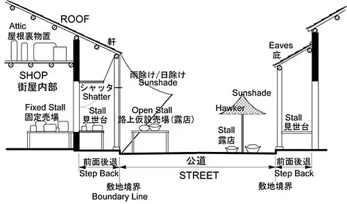 The term "five-foot" describes the width of the covered sidewalks.[2] The overhanging canopy, roof extension or projected upper floor on top of the five-foot ways provides a cover to shield pedestrians from the sun and the rain. As the ground floor of most commercial buildings in downtown areas is occupied by shops or eating places, the five-foot ways also function as corridors for people to window shop or look for refreshment. These corridors were used by traders to set up various small businesses in the past, and are still used this way in many countries.[1]