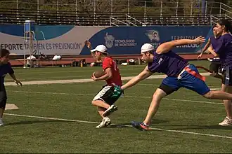 The Réseau du sport étudiant du Québec (RSEQ), a U Sports conference in Quebec, began sponsoring university women's flag football independently of U Sports in 2021.[41] Additionally, the RSEQ is also a member of the Canadian Collegiate Athletic Association (CCAA) and has sponsored college women's flag football since 2009 and men's flag football since 2017.[42][43] The version of flag football played by the RSEQ is a hybrid of American football and Canadian football rules, utilizing Canadian fields and scoring rules with the 4 downs seen in the American game.[44]