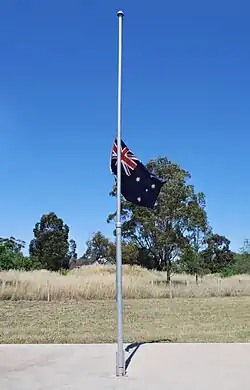When the flag is flown at half-mast, it should be recognisably at half-mast—for example, a third of the way down from the top of the pole.[25] The Australian flag should never be flown half mast at night, unless directed to half-mast for an extended period.[25] Days on which flags are flown at half-mast on government buildings include,[25]