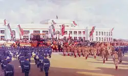 In the decades following federation the red ensign was the pre-eminent flag in use by private citizens on land. This was largely due to the Commonwealth government, assisted by flag suppliers, discouraging the use of the blue ensign by the general public.[62] Both the blue and red versions were used by armed forces during the First and Second World Wars (see: Flags of the Australian Defence Force).[63] A colourised version of a photograph held by the Australian War Memorial of the Armistice Day celebrations in Sydney's Martin Place, 11 November 1918, reveals both ensigns being displayed by the assembled crowd.[64][65] Illustrations and photos of the opening of Australia's provisional Parliament House in 1927 show Australian Ensigns flown alongside Union Jacks. However, sources disagree on the colours of the Australian flags, leaving open the possibility that either ensign or both were used.[59][66][67]