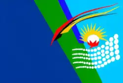 The flag of the Argentine province of Chaco is rectangular, divided into three vertical stripes, light green, white and light blue. In the middle stripe there is also a symbol of the Sun of May at the top and a plough surrounded by twenty-five golden stars at the bottom. The stars represent the twenty-five departments in the province. The plough symbolizes agriculture, which is the most important sector of the province's economy and is also found on the coat of arms.[1][2]