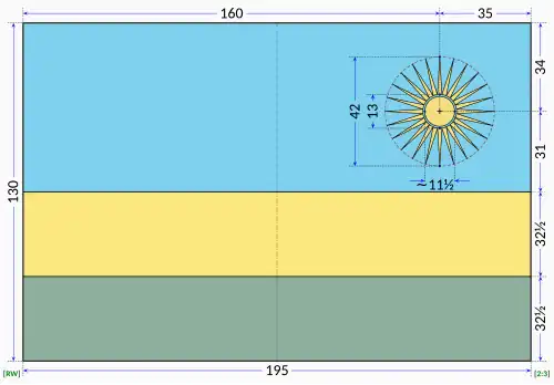 The government of Rwanda has specified dimensions, colours, and manufacturing parameters in which the flag is to be made. The flag consists of three horizontal stripes of blue, yellow, and green, from top to bottom.[3] The blue stripe covers half the flag and is twice the height of the yellow and green stripes, which are equal in size.[6][7] The upper fly-side (top right) corner features a golden sun with 24 rays that do not touch the sun's circumference.[6][7][3] The width-to-length ratio of the flag is 2:3.[8][9][a] Rwandan law no. 34/2008 gives specific dimensions for large flags outside or inside government buildings, large flags at national ceremonies, small flags inside government offices or on government vehicles, and flags on medals.[10] Physical flags should be made of 100% polyester and sewn in such a way that the threads connecting the stripes are not visible.[11]