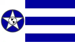 | Design | Upper navy blue half and lower beige half, separated by a gold horizontal line, with a gold shield on the left third, containing a red circle and beige six-pointed star. |