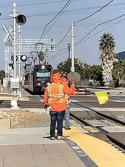 Before the advent of automated level crossing gates, and still where automatic gates are not installed, flagmen were also assigned to protect the crossings.[2] The flagman would stop road traffic from crossing the tracks as trains used the crossing.[3][4]