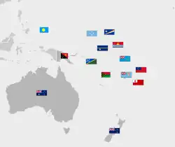 ![]() | 2009 – | Flag of Tokelau [25] | New Zealand (dependent territory) | A yellow Tokelauan canoe sailing towards the Southern Cross represented by four white stars on a blue field |