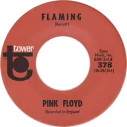 "Flaming" was also the third US Pink Floyd single (Tower 378) and was released by Tower Records, but it did not chart. The mono US single mix of "Flaming" is slightly edited from other stereo or mono versions of the recording. This US single was released in place of the UK single, "Apples and Oranges" (backed with "Paint Box"), which had then just failed to break into the UK charts.[5]