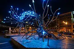 Soma is a stainless steel neuron that illustrates flowing electricity through crowd-controlled LED light patterns that shoot along its dendrites and axon. Soma appeared at Electric Daisy Carnival in 2013.[15] In 2014 it was installed at Pier 14 along the Embarcadero on the San Francisco waterfront for one year, adapted to light up with LED lights instead of the original balls of fire.[16] In 2016 it moved to Vallejo, California as a public art installation for two years, as part of an effort to draw visitors to the city's downtown and waterfront areas.[17]