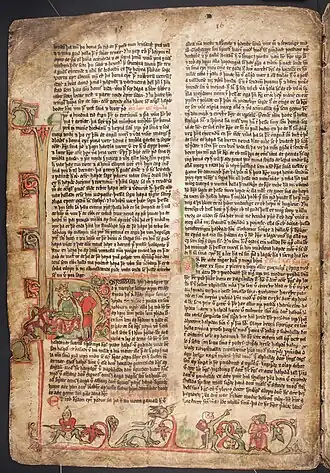 Flateyjarbók is the largest medieval Icelandic manuscript, comprising 225 written and illustrated vellum leaves. It contains mostly sagas of the Norse kings as found in the Heimskringla, specifically the sagas about Olaf Tryggvason, St. Olaf, Sverre, Hákon the Old, Magnus the Good, and Harald Hardrada. But they appear here expanded with additional material[2] not found elsewhere (some of it being very old) along with other unique differences. Most—but not all—of the additional material is placed within the royal sagas, sometimes interlaced. Additionally, the manuscript contains the only copy of the eddic poem Hyndluljóð, a unique set of annals from creation to 1394, and many short tales not otherwise preserved such as Nornagests þáttr ("the Story of Norna Gest").