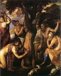 Beyond the purely technical means, many critics have tried to articulate evocations of Titian's pictorial language in this and other very late paintings.[65] According to Sydney Freedberg, "the surfaces of bodies make a silvered incanescence and the atmosphere, almost unbreathably dense, is like dulled fire. ...There is a wry comedy within the cruelty, ugliness and strangeness within the magisterial beauty, and terror accompanies the sense of the sublime."[66] For John Steer "it is not individual colours that tell, but an all-over emanation of broken touches, evoking a greenish-gold, that is splattered, appropriately to the theme, with reds like splotches of blood. Vision and expression are here so much one that they cannot, even for the purposes of discussion, be separated. .... Titian's intense struggle to grasp in paint, through tone and colour, the physical realities of the scene is a fundamental part of their meaning."[67]
