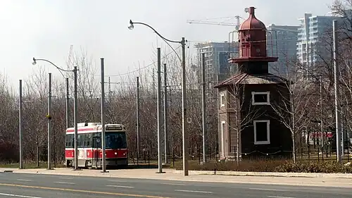 The Queen's Wharf Lighthouse (also known as the Fleet Street Lighthouse, after its current location) is a lighthouse in Toronto, Ontario, Canada, situated at Fleet Street just east of the Princes' Gates at Exhibition Place. The octagonal building was originally one of a pair of lighthouses built in 1861 at Queen's Wharf, replacing an earlier 16-foot lighthouse built in 1838.[1] The 11-metre (36-foot) three-storey wood structure is one of two surviving 19th-century lighthouses in Toronto (the other being Gibraltar Point Lighthouse).
