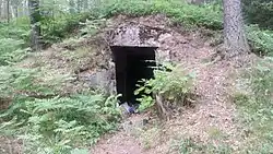 Closest to the enemy are several lines of anti-tank obstacles and minefields. Usually it means a V or U-trench and a wall or dragon's teeth row, while moats, hedgehogs and berms have been used very rarely because they are difficult to be camouflaged. Behind this lies an extensive, at least 30-meter-wide anti-infantry entanglement, which is a mixed system of apron fences, wire concertinas, electric fences, traps, mines, nail spikes and spike pits. Both elements are well camouflaged by good location (relief) and by plants (e.g. small height bushes in front of ditches).[1][7]