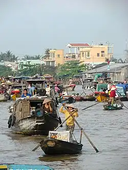 With two deltas from both the northern Red River and the southern Mekong River, floating markets were an important aspect of greater aquaculture-based society consisting of floating communities that inhabited the riversides of Vietnam.[1][2] Archaeologists have found evidence that extensive trading networks likely existed in Vietnam's river deltas from as far back as 4,500 years ago.[2][3] As far back as the 7th century, the southern riverways of the Mekong Delta were seen as prime migratory opportunities for those farther north.[4] Many of the communities consisted of cultural groups now associated with modern-day ethnic groups, such as Kinh, Chams, and Khmer.[4] The intersections of major riverways become major points of commerce and led to the proliferation of on-ground and floating markets.[4] Although economic growth and emerging technology over the 19th century provided alternative commercial avenues, floating markets remained a central meeting place into the 21st century as road infrastructure gradually developed in the Delta regions.[5] There have been increased efforts to preserve the traditional appearances of some floating markets as a form of both eco-tourism and cultural tourism.[6]
