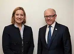Amber Augusta Rudd (born 1 August 1963)[2] is a British former politician who served as Home Secretary from 2016 to 2018 and Secretary of State for Work and Pensions from 2018 to 2019. She was a Member of Parliament (MP) for Hastings and Rye, first elected in 2010, representing the Conservative Party, and stood down from parliament in 2019. She identifies herself as a one-nation conservative,[3] and has been associated with both socially liberal and economically liberal policies.[4][5]
