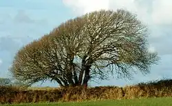 The Cornish Elm was once common in Cornwall but can now only be found outside Cornwall. The origin of the Cornish Elm in the UK remains a matter of contention; commonly assumed to have been introduced from Brittany by man, it is also considered possible that it may have survived the ice ages on lands to the south of Cornwall long since lost to the sea.[23] Certainly, its current distribution owes much to man's activities. The tree was traditionally considered the best choice for providing shelter along the Cornish coast; moreover its timber was much prized for its strength, and commonly used in wheel and wagon construction.[24]