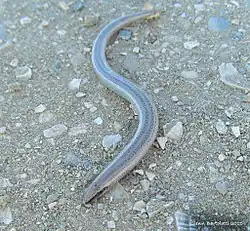 A unique lizard adapted to an underground existence, the Florida sand skink measures 10 to 13 cm (4 to 5 in) in total length and is a gray to tan color. Its forelegs are tiny and bear only one toe each; its hindlegs are small and have two toes. The tail comprises about half of the animal's total length. The sand skink has a wedge-shaped head, a partially countersunk lower jaw, body grooves into which the forelegs can be folded, and small eyes which have transparent windows in the lower lids. These features enable the lizard to move through loose sand.[5]
