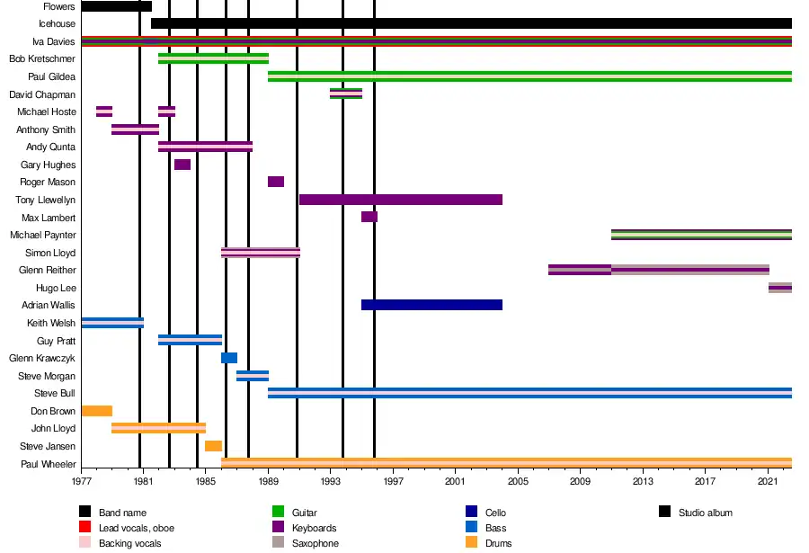 Icehouse are an Australian rock band, formed in Sydney in 1977 as Flowers. Initially known in their homeland for their pub rock style, they later achieved mainstream success playing new wave and synth-pop music and attained Top 10 singles chart success locally and in both Europe and the U.S.[1] The mainstay of both Flowers and Icehouse has been Iva Davies (singer-songwriter, record producer, guitar, bass, keyboards, oboe)[2] supplying additional musicians as required. The name "Icehouse", adopted in 1981, comes from an old, cold flat Davies lived in and the strange building across the road populated by itinerant people.[3]