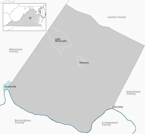 Fluvanna County is a county located in the Piedmont region of the Commonwealth of Virginia, United States. As of the 2020 census, the population was 27,249.[1] Its county seat is Palmyra,[2] while the most populous community is the census designated place of Lake Monticello. Fluvanna County is part of the Charlottesville, Virginia Metropolitan Statistical Area.