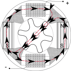 In the simplest case, the stator has four poles and the field coils and armature windings are arranged alternately around the stator between the poles. The field magnets are arranged with their poles opposing each other, i.e. one armature is between the two North poles, one between the two South. The rotor is a simple toothed disc of magnetic, but unmagnetized, iron. As it rotates between poles, it links the flux between a single pair of opposing poles. The magnetic circuit of the stator is thus a pair of triangles, each containing a field, an armature and a shared path through the rotor. Flux passes in each circuit from one field and through one armature. As the rotor turns, the other triangular path is formed, switching the flux from one pair of field and armature to the other and also reversing the direction of the flux in the armature coil. It is this reversal of flux that produces the alternating emf.[6]