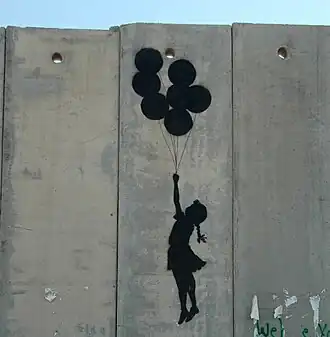 Flying Balloon Girl, also known as Balloon Debate, is a 2005 stencil mural in the West Bank by the graffiti artist Banksy, depicting a young girl holding a bunch of seven balloons floating above the 8 meter-high wall built around the Palestinian enclave near the Qalandia checkpoint.[1][2]