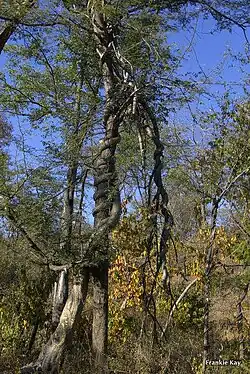 Fockea multiflora is a large climber up to 15 m, with a thick, fleshy trunk up to 30 cm thick, swollen toward the base but lacking a distinct basal tuber.[2][4] In mature plants the rootstock consists of a network of fleshy roots radiating from the base of the stem. By comparison, in the other five Fockea species, stems arise from a tuber that is much broader than the main stem.[2] F. multiflora is rarely shrub-like; rather, its stems sprawl on the ground or twist around surrounding trees[2][4] as massive lianas, appearing to strangle them, although there’s no evidence that the supporting trees are harmed.[2] The stems produces a white, milky latex.[1][6] Young stems are tomentose (covered with densely matted wooly hairs), later becoming covered with grey, shiny bark.[2][4]