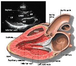 | Click on a figure to enlarge it and see some parts of the heart identified. RV, right ventricle; LV, left ventricle; RA, right atrium; LA, left atrium; TV, tricuspid valve; MV, mitral valve; AV, aortic valve; RVOT, right ventricular outflow tract; LVOT, left ventricular outflow tract | |||||||||||