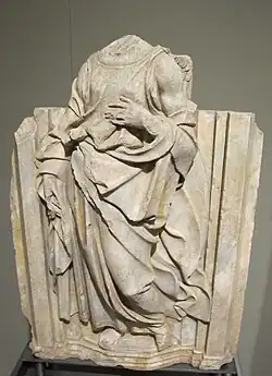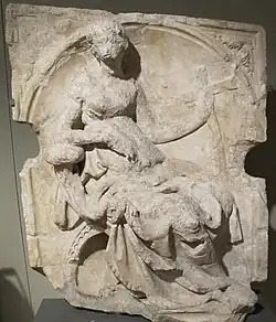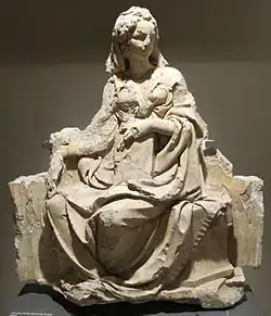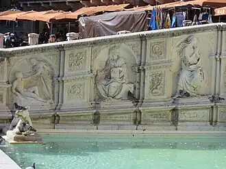 The first fountain in the Piazza del Campo was completed in 1342, after hydraulic construction had led water to the site. Underground pipes brought water to the site from 25 kilometers away.[1] Legend holds that the fountain was met with much joy, thus it was given the name Gaia or joyous. Others suggest the term Gaia refers to the Latin term for "bride", and that the fountain was dedicated to the bride of God and patron of Siena, the Virgin Mary.[2] The fountains, plates, and statues conflate Roman matrons' cardinal virtues, with a central relief of the Madonna and Child, curiously framed by stories of Genesis.