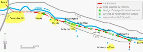 The aqueduct's route followed the Cher valley along its left bank, totally or partially embedded in the limestone hillside, except a few engineering structures required to cross valleys, almost in a straight line between Bléré and Saint-Avertin, a commune bordering Tours from which it is separated by the Cher. Although a large part of its route is attested, it has not been possible to identify its course beyond Saint-Avertin, in an area that has been profoundly altered by urbanization, which still casts doubt on its final destination and even on the premature interruption of its construction.