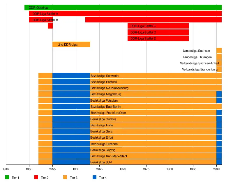 For most of its history, competitive GDR football was divided into three tiers. The Oberliga was founded in 1949, and served as GDR football's highest tier of competition throughout the country's existence.[1]
