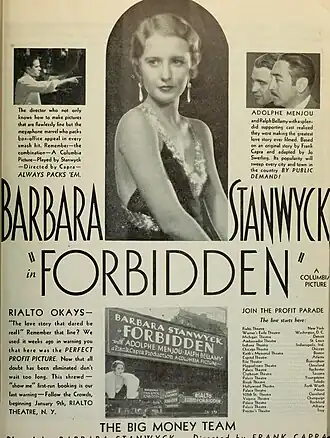 Forbidden is a 1932 American pre-Code melodrama film directed by Frank Capra and starring Barbara Stanwyck, Adolphe Menjou, and Ralph Bellamy. An original story inspired by the 1931 novel Back Street by Fannie Hurst, with a screenplay by Jo Swerling, the film is about a young librarian who falls in love with a married man while on a sea cruise.[1][2]