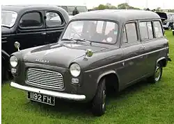 It was a two-door, four-seat estate design, related to the Ford Prefect 100E four-door saloon, sharing the same 1,172 cc (71.5 cu in) Ford sidevalve 36 bhp (27 kW) engine and other parts and the same interior trim. It was substantially shorter than both the Prefect and the closely related Ford Anglia 100E two-door saloon. It used the short front doors of the four-door model because the bodyshell was optimized for use as a panel van (which was marketed as the Thames 300E). The rear door was in two pieces split horizontally. The rear seat could be folded flat to convert from a four-seater to a load carrier. Until 1957 there were wood trim pieces screwed to the sides of the vehicle.