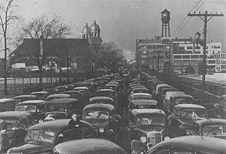 During the Ford Strike of 1945, a huge barricade of workers' cars and trucks were assembled on November 4, 1945, along Drouillard and Riverside.[12] Some 1500 to 2000 vehicles reinforced the United Autoworkers picket line and prevented a violent assault by a joint force of Ontario Provincial Police (OPP) and Royal Canadian Mounted Police (RCMP) officers.[13] This police intervention resulted when the Windsor Police Commission (WPC) asked Ontario Attorney-General Leslie Blackwell for additional reinforcements, in an effort to aid in "maintaining law and order."[14]