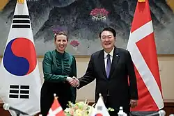 In September 2023, Yoon mentioned strengthening green growth cooperation between the two countries during a meeting with Danish Prime Minister Mette Frederiksen. Frederiksen called for expanded cooperation to include areas such as offshore wind, eco-friendly shipping, sustainable agriculture, and even quantum technologies.[39]
