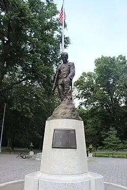 Forest Park has several sculptures and memorials. At the intersection of Park Lane South and Myrtle Avenue is the Joseph E. Schaefer Medal of Honor Memorial, an octagonal planting bed that was named after a Richmond Hill resident who served in World War II. The Schaefer memorial, dedicated in 1987, includes a pedestal with an artillery shell atop it.[81][82] Nearby is the Richmond Hill War Memorial, sculpted by Joseph Pollia in 1925; it depicts a "doughboy" or American infantryman.[83][84] This memorial is one of a few doughboy statues in New York City.[84] The same intersection contains a bronze flagstaff manufactured by the Gorham Manufacturing Company, which is located atop a 10-foot-tall (3.0 m) pedestal and a 4-foot-tall (1.2 m) granite base.[85] In addition, there is a plaque commemorating Corporal Robert Gray, who died in World War I.[86]
