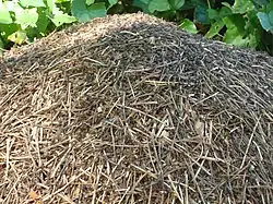 F. obscuripes creates distinct, dome-shaped mounds composed of varying materials found in the nest's surrounding environment. This composition is primarily vegetation and is commonly called "thatch". The mounds are typically constructed in areas devoid of cover to expose the nest to sunlight. The size of these mounds is highly variable and is mostly determined by the age and health of the colony. The height ranges from 1 to 18 inches (15–45 cm), although nests of larger heights are not uncommon, and can extend down to 4 ft (1.2 m) in the ground, with chambers present in both the thatched mound and the soil. The condition of the thatched mound is in a constant state of change due to activities by the ants and changes in the environment.[3] To prevent plants from shading the nest, the ants may chew off the bark at the base of plants growing on or nearby the mound. Formic acid is then sprayed into the open layer eventually killing and felling the plants.[4]