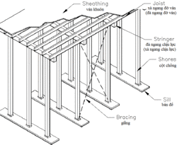 Similar to the traditional method, but stringers and joists are typically replaced with engineered wood beams and supports are replaced with adjustable metal props. This makes this method more systematic and reusable.