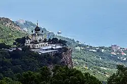 The Church of Christ's Resurrection (Russian: Воскресенская церковь, romanized: Voskryesyenskaya tserkov'; Ukrainian: Церква Воскресіння Христового, romanized: Tserkva Voskresinnia Khrystovoho) is a popular tourist attraction close to the southernmost tip of the Crimea, known primarily for its scenic location, overlooking the Black Sea littoral from a 400-metre cliff near Baidarsky Pass.
