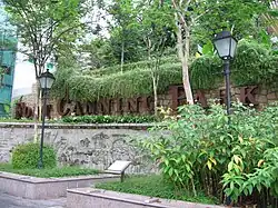 A Christian cemetery used to exist on the hill, serving as the burial ground for early Europeans in Singapore. The first Christian cemetery was used until 1822 and had 3 burials, was located close to Raffles house.[17] The second cemetery was located on the slopes of Fort Canning Hill, and was expanded and consecrated in 1834. A brick wall and a Gothic gateway were constructed in 1846 to enclose it, built by Captain Charles Edward Faber. Two classical monuments, and some headstones placed along brick walls remained at the site.[18] The cemetery continued to be used until 1865 when it was declared full and closed. By this time, around one third of the burials there were of Chinese Christians.[17] In the 1970s the cemetery was exhumed and many of the surviving tombstones were embedded in the surviving walls.
