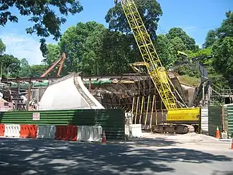 To make way for the construction process, the old National Library was demolished and moved to its present location along Victoria Street.[5] Sections of Canning Rise were closed twice during the course of construction. First, a stretch of road was closed for three months from 1 July 2004.[2] After this, a different section was closed "to facilitate the reinstatement works" of the FCT from 25 April 2006 for a period of two months.[10] However, this second closure was extended to 31 August.[11] In addition, a section of Stamford Road was temporarily redirected through the SMU campus near Prinsep Street during construction[4] before its final realignment in front of the National Museum.[3]