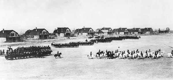 Fort Custer had quarters for 10 companies including stables for 6 troops of cavalry. It was built with buildings surrounding a large parade ground but had no walls or other fortifications[3]