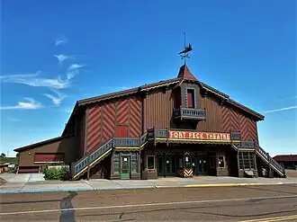 The Fort Peck Theatre was built as a temporary structure in 1934 in Fort Peck, Montana, to serve as a movie theatre. It is also known as the Fort Peck Summer Theatre. The theater was designed in a pseudo-Swiss-chalet style as an amenity for the 50,000 U.S. Army Corps of Engineers workers and their families at the Fort Peck Dam project. The interior features open-truss wood construction, with handcrafted light fixtures fabricated in Corps of Engineers workshops. The theater survived to become a permanent facility, and in 2008 was in use as a community theater.[2]