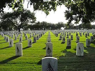 Fort Sam Houston National Cemetery is a United States National Cemetery in San Antonio, Texas. Administered by the United States Department of Veterans Affairs, it encompasses 154.7 acres (62.6 ha), and as of 2014, had over 144,000 interments. The cemetery was listed on the National Register of Historic Places in 2016.