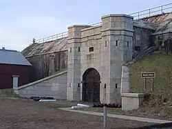 Facilities for planting and controlling an underwater minefield were built as well.[5] Battery Dynamite was one of a few built for Zalinski pneumatic dynamite guns; these used a dynamite-loaded projectile with a much larger explosive charge than conventional guns of similar bore. However, they also had a much lower velocity with consequent fire control problems and were withdrawn from service by 1902.[12] Batteries Bloomfield, Richardson, Halleck, and Alexander together formed the "Nine Gun Battery" with one of the longest continuous gun lines in the Endicott system. They were begun as the seven-gun Battery Halleck in 1896, built on top of the third system fort, and were divided in 1904 after expansion to nine guns.[5] The unnamed one-gun battery contained a 4.72-inch (120 mm) French-made Schneider gun unique in the US artillery system; it was probably a test gun from the Proving Ground pressed into service after the outbreak of the Spanish–American War.[13] The 3-inch (76 mm) batteries were often called "mine defense" guns, intended to defend a minefield against minesweepers.