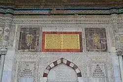 Above the drinking fountains and niches on each façade and sebil are large calligraphic plates bordered with blue and red tiles. Each plate bears stanzas of a 14-line poem dedicated to water and its donor by Seyyid Hüseyin Vehbi bin Ahmed, the chief judge of Halep and Kayseri. It is read clockwise around the fountain, beginning at the northern sebil. The last stanza of the poem the northwest façade is a chronogram composed by Ahmed III.
