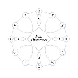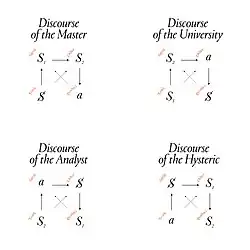 Four discourses is a concept developed by French psychoanalyst Jacques Lacan. He argued that there were four fundamental types of discourse. He defined four discourses, which he called Master, University, Hysteric and Analyst, and suggested that these relate dynamically to one another.[1]