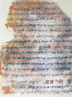 The folios include text from Genesis 12:17–13:14 and Genesis 15:2–15:12.[4] In addition, they contain the beginning of Paul's first letter to the Corinthians 4:9-16. It is an expanded Gregorian sacrament, and is relatively small. Scholars theorize that it was meant as a book used by a travelling missionary, due to its small size.[5]