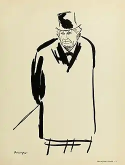 Coppée was famed as le poète des humbles (the poet of the humble). His verse and prose focus on plain expressions of emotion, patriotism, the joy of young love, and the pitifulness of the poor.[3] Coppée continued to write plays, mostly serious dramas in verse, two of which were composed in collaboration with Armand d'Artois. The performance of a short episode of the Commune, Le Pater, was prohibited by the government in 1889. Coppée published his first prose work in 1875 and went on to publish short stories, an autobiography of his youth, a series of short articles on miscellaneous subjects, and La Bonne Souffrance, a popular account of his reconversion to the Roman Catholic Church. His conversion was due to a severe illness which twice brought him close to death.[3]