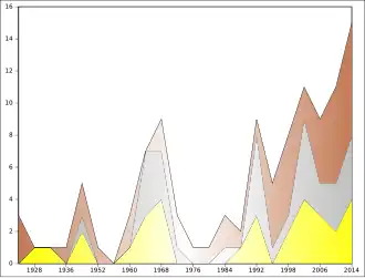 - ^ a b Does not include a bronze medal by a mixed team that included French players.